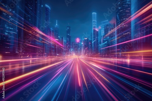 © twilight mist, Fototapeta premium Neon Cityscape with Blurry Speed Lines