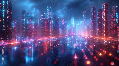 © Ashalina, Naklejka premium Neon Cityscape with Futuristic Glow. Generate AI image