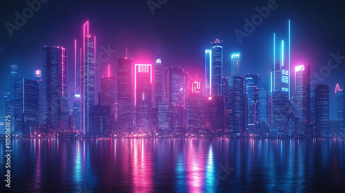 Fototapeta premium Neon Cityscape With Futuristic Skyline Reflecting On Water Modern Architecture Night View