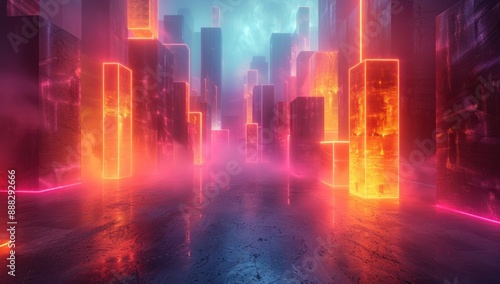 © @_ greta, Fototapeta premium Neon Cityscape with Glowing Pillars