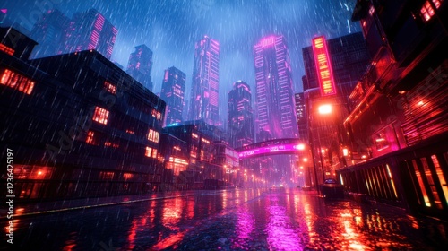 Fototapeta premium Neon Cityscape with Rain at Night in Futuristic Urban Environment