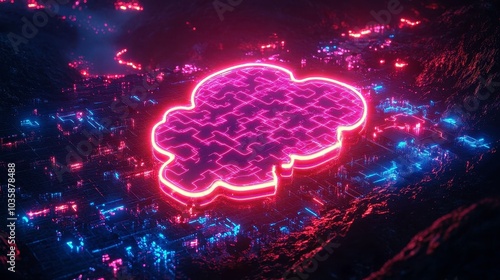 © Plumeria, Fototapeta premium Neon Cloud Over Digital Landscape Futuristic Technology Visualization