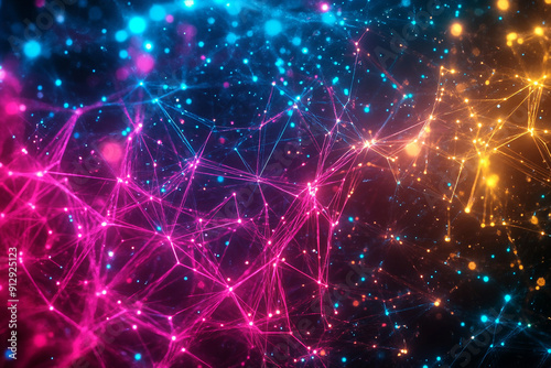 © Suriyo, Obraz premium Neon-colored data visualization with connected nodes neon-colored