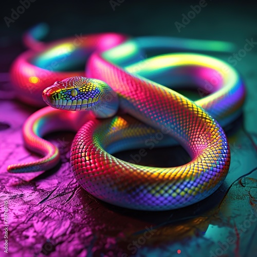 © Obsidian, Fototapeta premium Neon colored Rainbow snake in neon light on a dark background. 3d render.