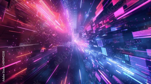 © javier, Fototapeta premium Neon-colored shapes float in dark void of digital dreamscape backdrop