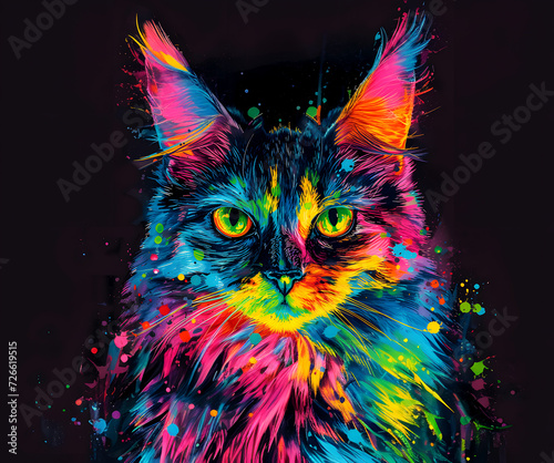 © Dzenka, Obraz premium Neon colorful cat on a black background. Ai generated.