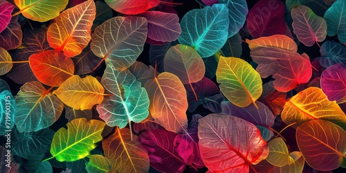 © Fayrin, Naklejka premium Neon colorful leaves are strewn across a black background.