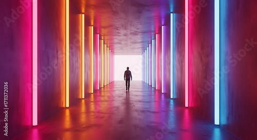 © rian, Fototapeta premium Neon Corridor Journey of a Person.