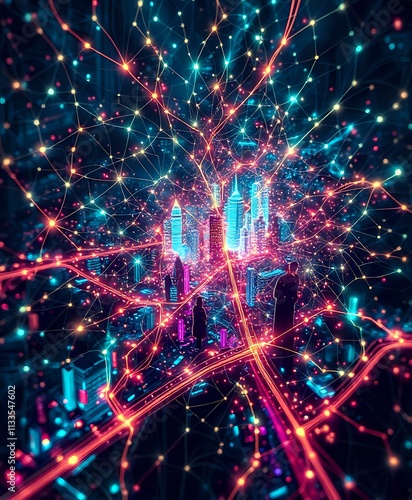 © Taria Technology, Fototapeta premium Neon Cybernetic Cityscape at Night