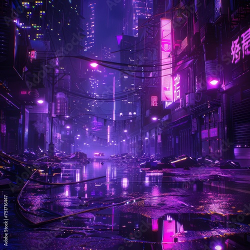 Fototapeta premium Neon Cyberpunk City, Urban Future Metaverse, Night Purple Street Texture...