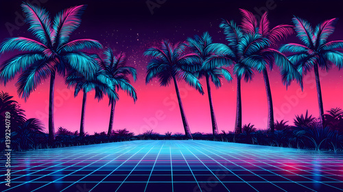 Naklejka premium Neon Dreams: Synthwave Serenade of Retro 80s Grid and Palm Bliss