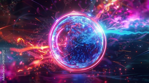 Obraz premium Neon Energy Sphere Surrounded by Dynamic Particles