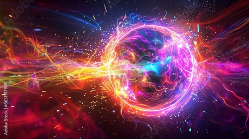 Obraz premium Neon Energy Sphere Surrounded by Dynamic Particles