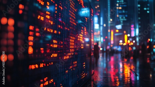 © Jirakit, Naklejka premium Neon Financial Data Display in Urban Environment