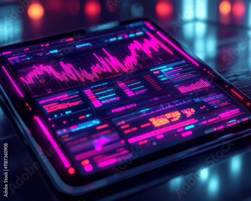 © Ryzhkov, Obraz premium Neon Financial Insights on Tablet Modern Digital Finance and Investment Visualization