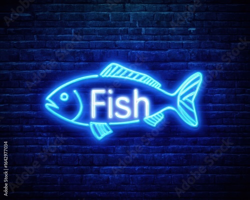 © Maryna, Obraz premium Neon Fish Sign. Creative fish neon signs with blue brick wallpaper background