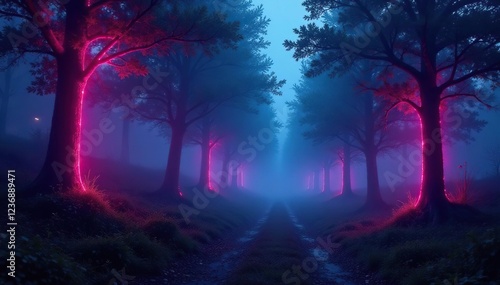Fototapeta premium Neon forest at dawn with misty atmosphere and glowing trees, neon forest,...