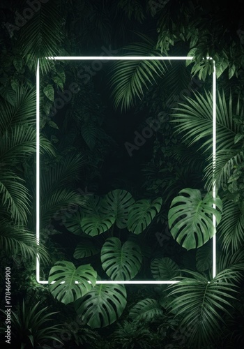 © Lemdah, Fototapeta premium Neon frame in jungle foliage