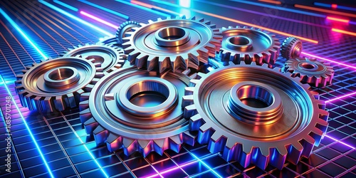 Obraz premium Neon Gears in Motion, 3D Rendered, Metallic, Gear, Mechanism, Technology, Cyberpunk
