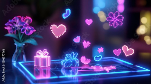 Fototapeta premium Neon gift, flowers, hearts on glowing digital tablet.