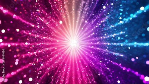 © Sidra, Obraz premium Neon Glitter Background with Bokeh Glow and Fluorescent Blue Magenta Pink Gradient Sparkles