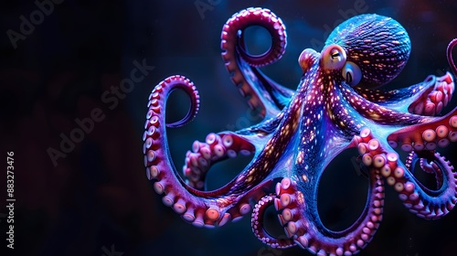 © Thares2020, Naklejka premium Neon Glow Octopus Spreading Tentacles Against Dark Background