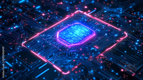 © Thiago, Obraz premium Neon glowing circuit board representing ai artificial intelligence and technological advancements. Futuristic Neon Circuit. Illustration