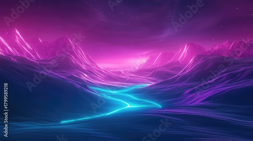 © vectorwin, Fototapeta premium Neon glowing river flowing through futuristic purple mountains