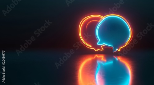 Obraz premium Neon glowing speech bubbles reflecting on dark surface.