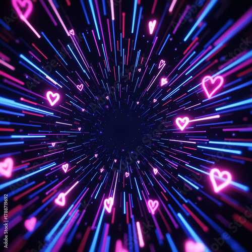 © Photobank, Fototapeta premium Neon Hearts Exploding with Speed Lines in Pink and Blue Radial Burst