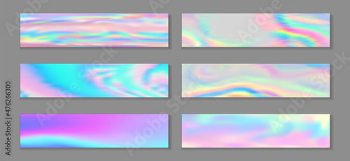 © SunwArt, Fototapeta premium Neon holo blurred flyer horizontal fluid gradient princess backgrounds vector set. Pearlecent