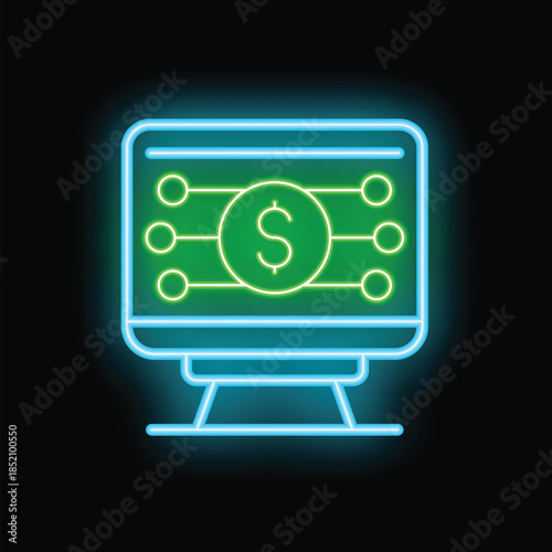 © ylivdesign, Obraz premium Neon icon of a computer screen displaying a dollar sign connected to nodes, representing online banking and financial technology