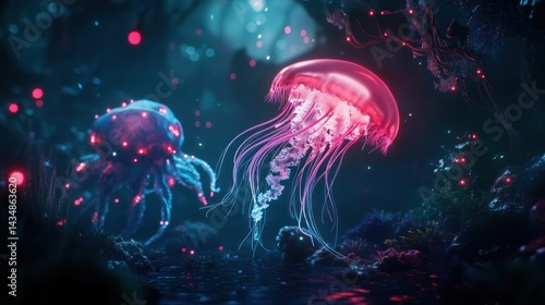 © NUMBER BLACK, Obraz premium Neon Jellyfish
