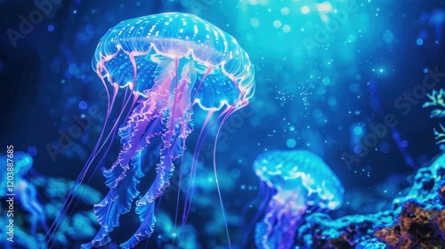 Fototapeta premium Neon Jellyfish Glowing Underwater in Dark Ocean