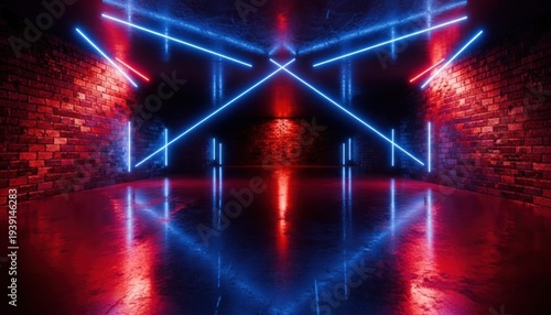 Fototapeta premium Neon laser light show in dark brick underground tunnel futuristic glowing red blue