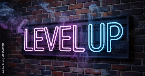 Obraz premium Neon Level Up Sign on Brick Wall with Smoke and Vibrant Colors