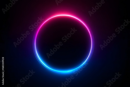© Kdhtdg, Obraz premium Neon light effect with a glowing circular frame on a dark background. The blue and pink neon glow forms the shape of an empty ring,