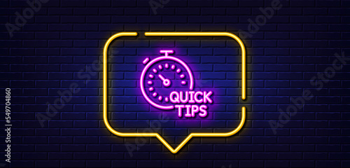 © blankstock, Fototapeta premium Neon light speech bubble. Quick tips line icon. Helpful tricks sign. Tutorials with timer symbol. Neon light background. Quick tips glow line. Brick wall banner. Vector