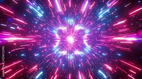 © NAIMAH, Naklejka premium Neon light streaks explode from center in dark space; cosmic background; futuristic design