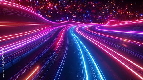 Obraz premium Neon Light Trail Digital Map, Business Theme, , Neon, Light Trail