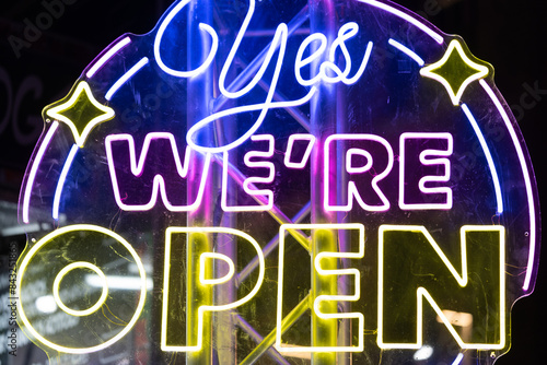 Fototapeta premium Neon light Yes we're open sign night festival pink yellow