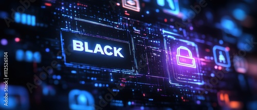 Fototapeta premium Neon lights and text on black digital circuit background