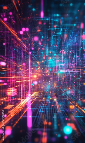 Fototapeta premium Neon lights, digital grid, glowing abstract.