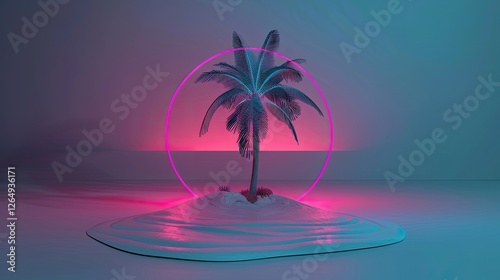 Naklejka premium Neon lights forming a circle, a palm tree in front of it, a sea view