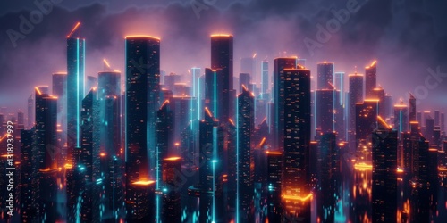 © photolas, Fototapeta premium Neon Lights Illuminate a Futuristic Skyline at Dusk in a Modern Cityscape