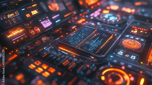 Fototapeta premium Neon lights illuminate a high-tech interface filled with graphs, data points,...
