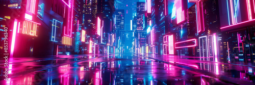 Fototapeta premium Neon lights in architectural shapes, forming an abstract cityscape that glows...