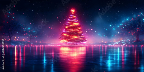 Naklejka premium Neon Lights Reflect on Frozen Lake, Festive Christmas Tree Glows Brightly