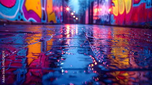 © ichie, Obraz premium Neon Lights Reflecting on Wet Pavement in City Alleyway - Photography