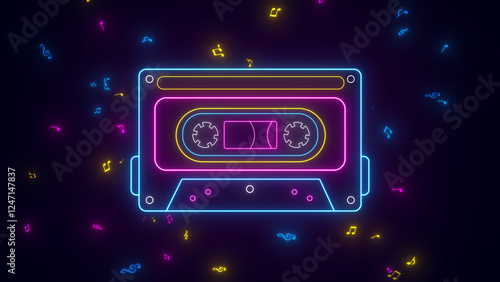 Fototapeta premium neon lights retro cassette tape and music notes flying ,music song nostalgic...